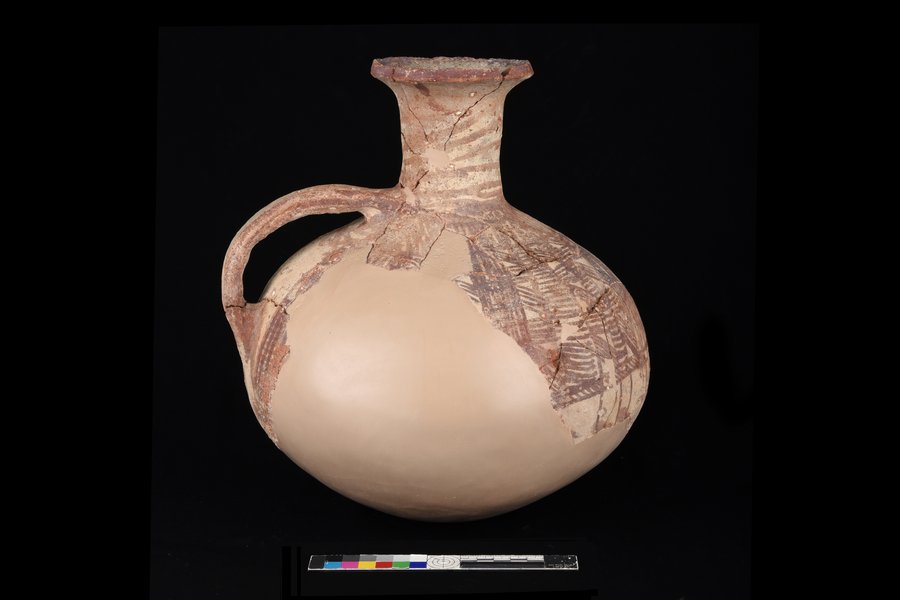 يتميز وعاء السكب المصنوع يدويًا بشكل مدور . وربما كان له قاعدة مستديرة اختفت مع مرور الزمن. جسم القطعة مغطى بالكامل بلون كريمي، وفيه زخارف باللون الكستنائي. يدل وجود مقبض واحد على أن الوعاء كان يستخدم لسكب السوائل، مثل الماء والمشروبات الأخرى.