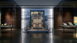 كانت قطعة القماش الكبيرة هذه، جزءاً من الكسوة الشريفة، التي تُغطي الكعبة، والمصنوعة – حتى يومنا هذا – من أقمشة متنوعة، ويتم استبدالها كل عام. هذا الجزء من الكسوة هو "الستارة"، كما يطلق عليه اسم "البرقع" في مصر، حيث تُشير هذه التسمية إلى القطعة الموضوعة فوق أبواب الكعبة المشرفة، وهو الجزء الأكثر زخرفةً وتطريزاً. كان كساء الكعبة، المصنوع من مختلف أنواع الأقمشة، أحد الطقوس الممارسة في الجاهلية قبل زمن النبي محمد ﷺ. كانت الأقمشة تُرسل من القاهرة كهدايا في مَحْمَل، على رأس موكب قافلة الحجاج إلى مكة المكرمة. تم تأسيس ورشة عملٍ مخصصة، لإنتاج هذه المنسوجات فقط، وأُطلق عليها اسم "دار الكسوة"، التي تأسست في القاهرة عام 1233هـ /1817م من قِبَل الحاكم العثماني محمد علي باشا. تُشير الرصيعة، الموجودة عند فتحة الستارة، إلى أن هذه القطعة صُنعت بتكليف من السلطان عبد المجيد (حكم من 1254 إلى 1278هـ / من 1839 إلى 1861م)، ومؤرخة عام 1263هـ /1846 - 1847م. كما أنها مطرزة بالذهب والفضة على الحرير الأسود والأحمر والبني الفاتح (البيج)، وتحتوي على العديد من النقوش القرآنية، بما في ذلك سورة الفاتحة وسورة الإخلاص وآية الكرسي والشهادتين.