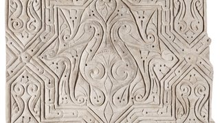 This dado panel is one of a group of fine stucco wall revetments that originally came from the site of Samarra (approximately 120 km north of Baghdad), the short-lived yet extraordinary Abbasid capital that functioned as a caliphal seat during most of the 2nd–3rd centuries AH/9th century CE. Stucco rose to major prominence when the early Abbasid caliphs designed their new luxurious palaces. This example shows the exquisite carving, featuring geometric interlaced bands, producing large eight-pointed stars, filled with stylised plant motifs. The craftsman seemed particularly talented in executing the details with great accuracy. The decoration of this stucco panel belongs to what is generally known as the characteristic ‘Samarra style C’, or ‘bevelled style’, believed to have spread as a new visual language from Samarra to other centres of the Abbasid Empire.