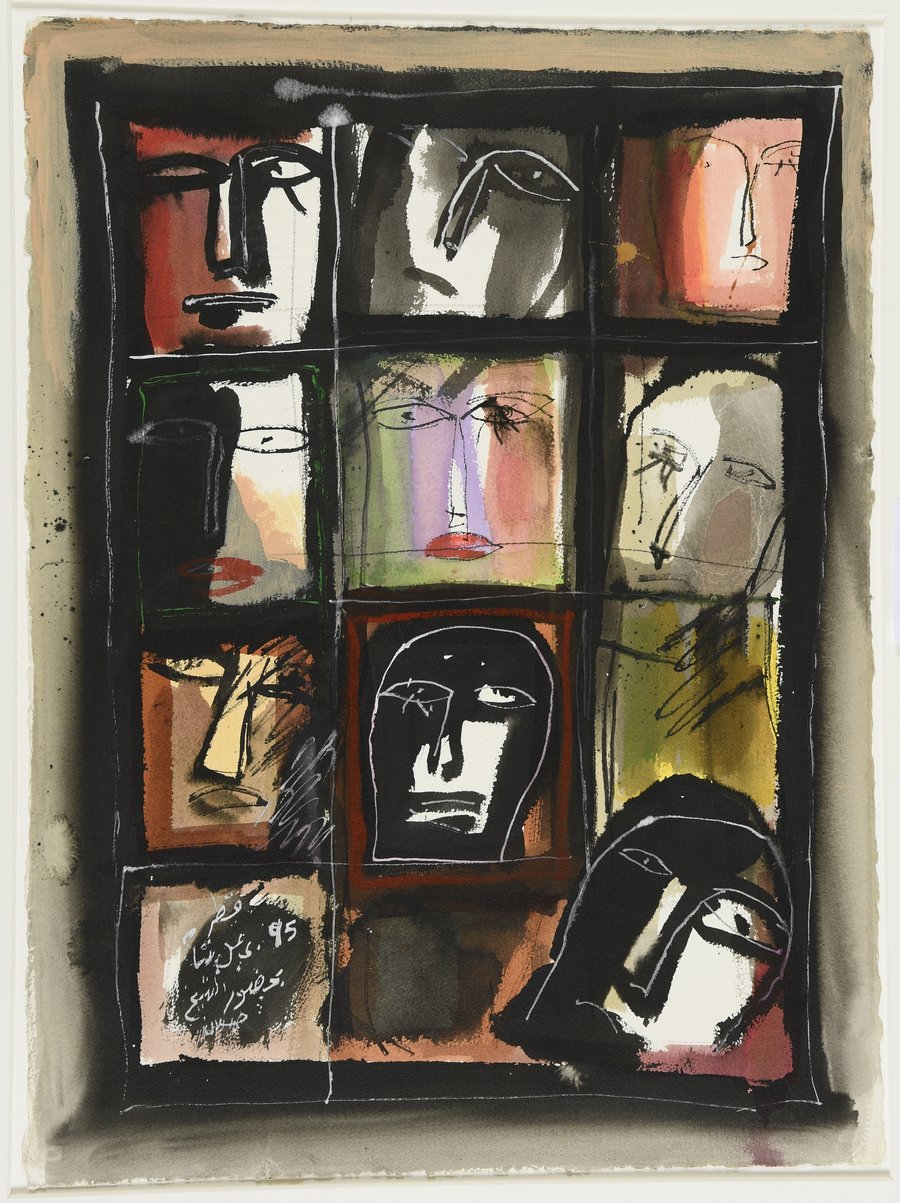The artwork features nine individual faces arranged loosely inside a hand-drawn grid. Fattah uses abstract figuration to guide the viewer's attention to each face. Their simple, minimal features, something Fattah often preferred, create a sense of mystery and emotional depth.