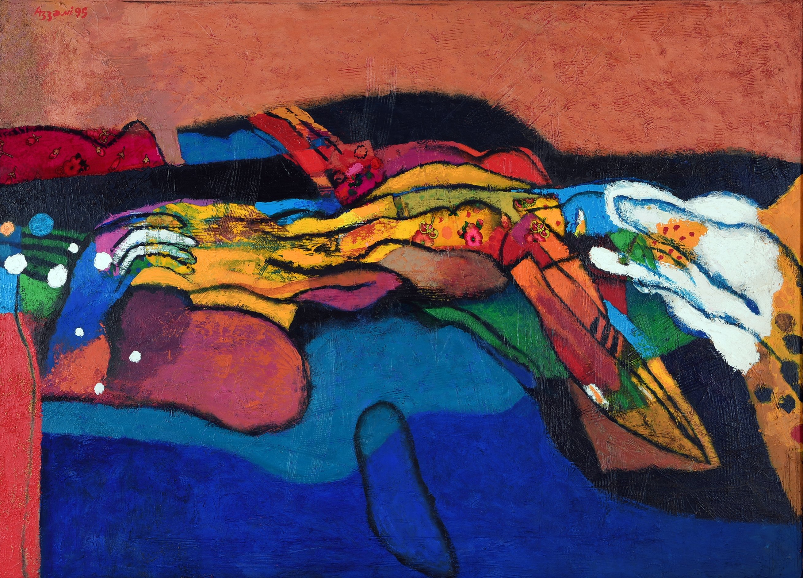 Iraqi artist Dia al-Azzawi’s blinds contemporary visual language with historical cultural references. Themes of exile, identity, resilience, and the wider political and human experience are common in his work. His signature use of bold, saturated and vibrant colours adds further depth to these ideas.