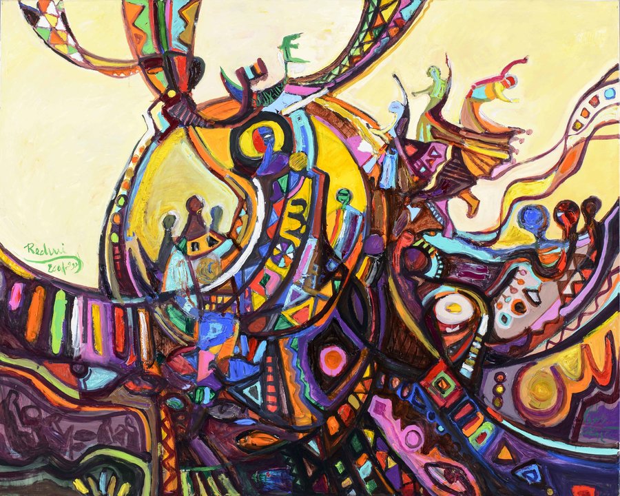 He created this artwork in 2001, while working as an artist in residence in Madinat Khalifa, a private residency programme founded by Sheikh Hassan bin Mohammed bin Ali Al Thani. Vivid colours characterise this piece. These colours flow through the dancing figures and abstract shapes, echoing patterns often found in textiles from the Gulf.