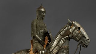 This horse armour is one of only seventeen examples to survive from the medieval Ottoman period. Made in Turkey, it bears the marks of the Arsenal of St Irene, the Turkish Armouries in Istanbul. Designed to allow for maximum movement in battle, one can see that the horse’s body armour is made up of numerous overlapping panels of thin steel. This is typical of a type of armour called ‘lamellor’ or ‘Armour of Scales’ that was developed in the Islamic world by the second half of the 9th century AH/15th century CE. The only heavy piece of solid plate is the headpiece on the horse which is attached to lighter overlapping cheek panels. The rider’s armour is also complete but the helmet as well as the shield and mace are of a slightly later date. The rider is covered from head to foot in chain mail, yet one can see that lamellar steel strips have been worked into the torso at the back and front, and into the upper legs to reduce the weight of the extremely heavy chain mail and to allow greater flexibility. Because of its lightness, lamellor armour became increasingly popular throughout the Islamic world and particularly in Turkey and India. This rare example of horse armour was probably kept at the St Irene Arsenal until 1255 AH/1839 CE when Sultan Abdulmejid I (1238-1278 AH/1823-1861 CE) ordered its closure and the contents were dispersed.