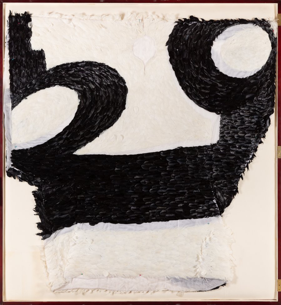 An artist, art collector and a patron of Arab art, Sheikh Hassan bin Mohammed bin Ali Al Thani uses falcon feathers to create this marvelous and fashionable artwork. The falcon is a symbol of pride, power and nobility in the Arab world, and Al Thani utilises its feathers to pay homage to the traditional sport of falconry still practiced today.