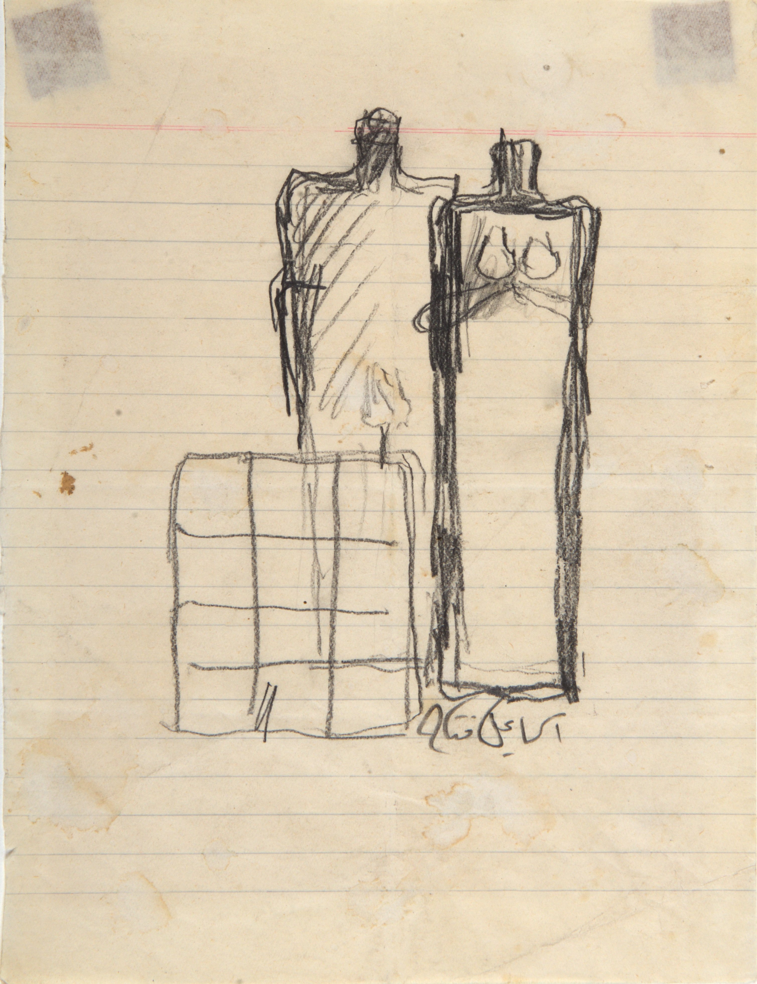 This influence appears in the sketch through static positioning, broad shoulders and clasped hands of the two figures, a simplified man and a woman. Using his own artistic lens, Fattah employed minimalism to capture the essence of his subjects.