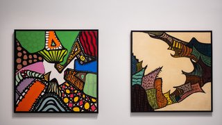 Suburb demonstrates Caland’s distinctive, vibrant and joyful art style, highlighting the links between the various mediums with which she actively engaged. The textile-like patterns in this painting resemble patches of fabric sewn together, a common technique by the artist, representing a suburb in an abstract form. These compositions reflect the broader influences and experiences that defined her visual language.